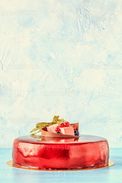 Торт с красной глазурью, фруктами и шоколадом