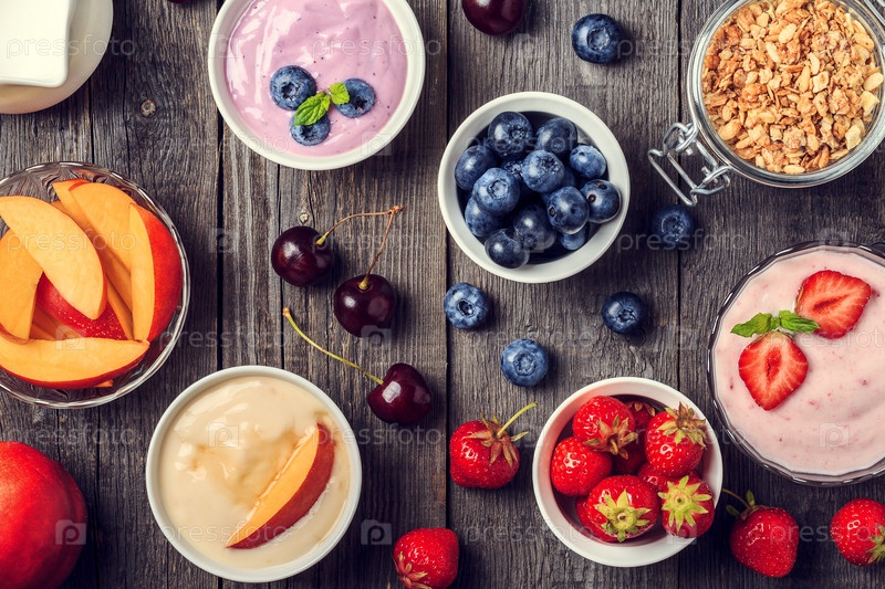 Домашний йогурт со свежей клубникой, черникой, персиком на деревянном фоне