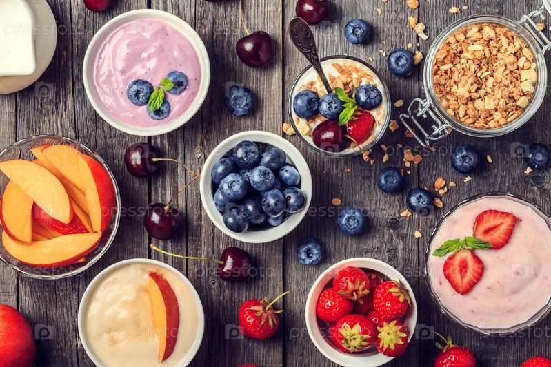 Домашний йогурт со свежей клубникой, черникой, персиком на деревянном фоне