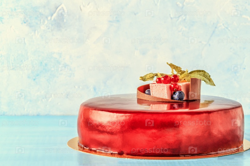 Торт с красной глазурью, фруктами и шоколадом