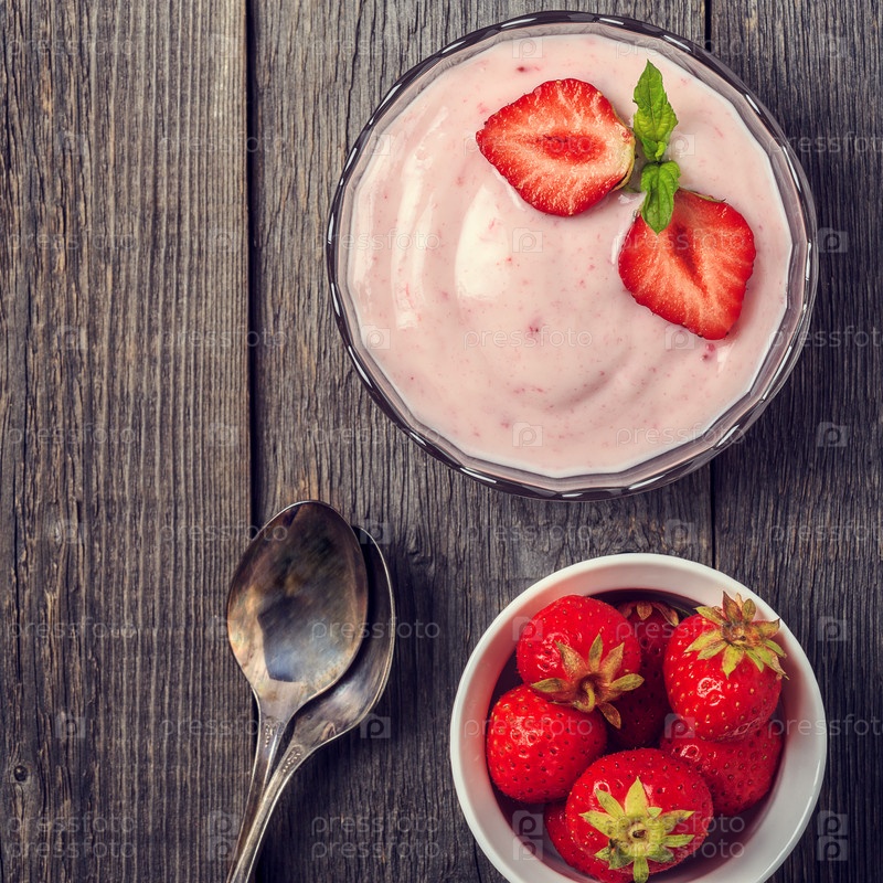 Домашний йогурт со свежей клубникой на деревянном фоне