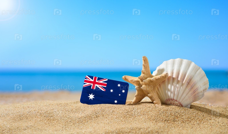 Тропический пляж с ракушками и флагом Австралии. Концепция райского отдыха на пляжах Австралии