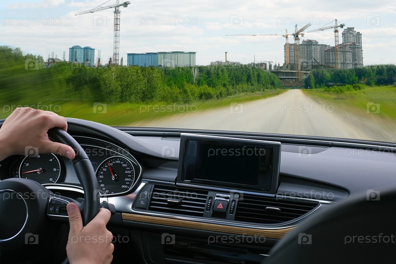 Водитель в салоне автомобиля едет в город