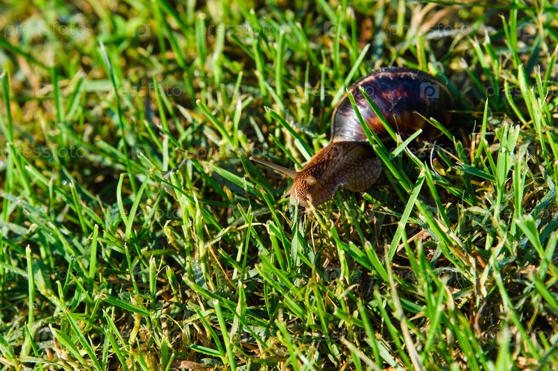 Ранним утром по зеленой траве ползает огромная улитка Ахатина. Выборочная фокусировка