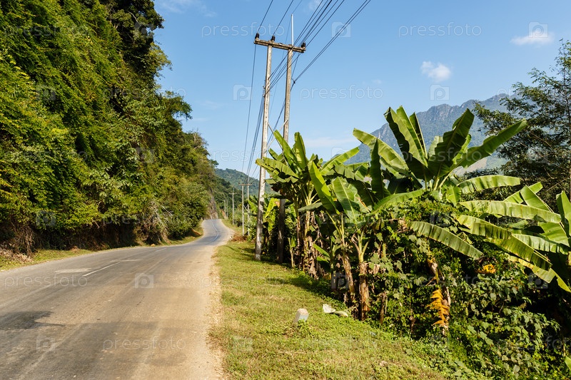 Асфальтированная дорога и линии электропередач в горах, провинция Удомсай, Лаос