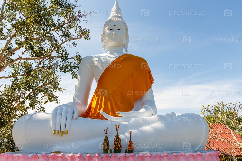 Белая статуя Будды, сидящего в позе лотоса, с оранжевой накидкой Лаос, провинция Луангпхабанг