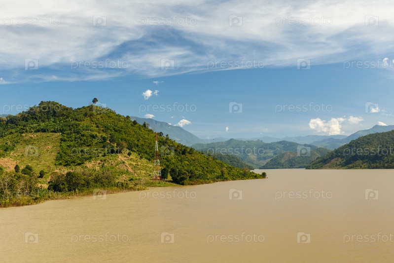 Река меконг, граница провинции Сайнябули и провинции Луангпхабанг, Лаос, вид с моста через реку