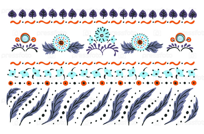 Набор этнических элементов. Бордюр представляет собой полосу с цветами, листьями, ветками, вензелями. Народная вышивка. Славянский, украинский, русский мотив. Хохлома, матрешка, дымковская игрушка. Мексиканский, индийский, цыганский ковер. Вязаное кружево