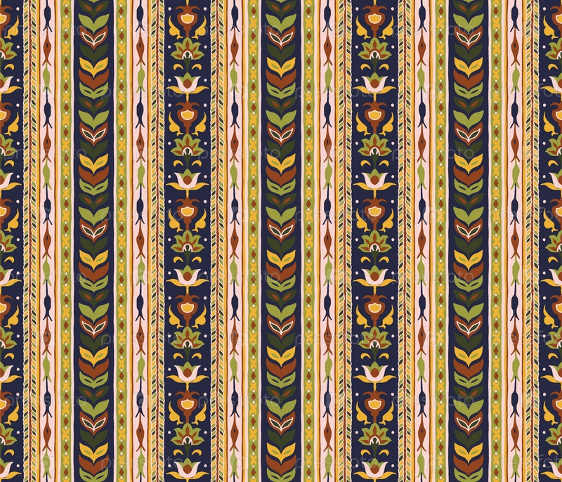 Геометрический дамасский орнамент. Икат границы. Этническая вышивка с листьями и монограммами. Племенная векторная текстура. Бесшовный народный узор в ацтекском стиле. Индийский, скандинавский, цыганский, мексиканский, африканский ковер