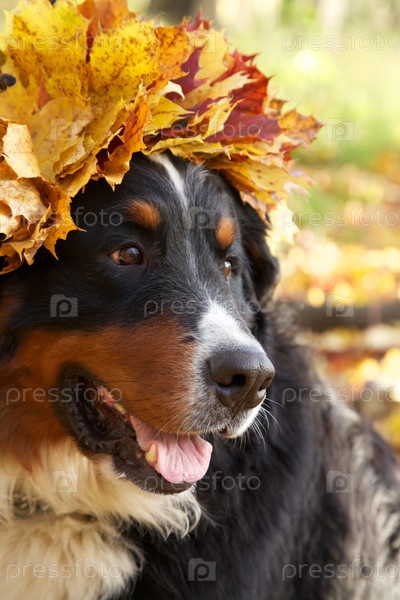 Бернский зенненхунд в желтых листьях