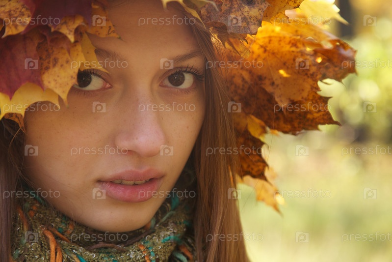Серьезная девушка в желтых листьях