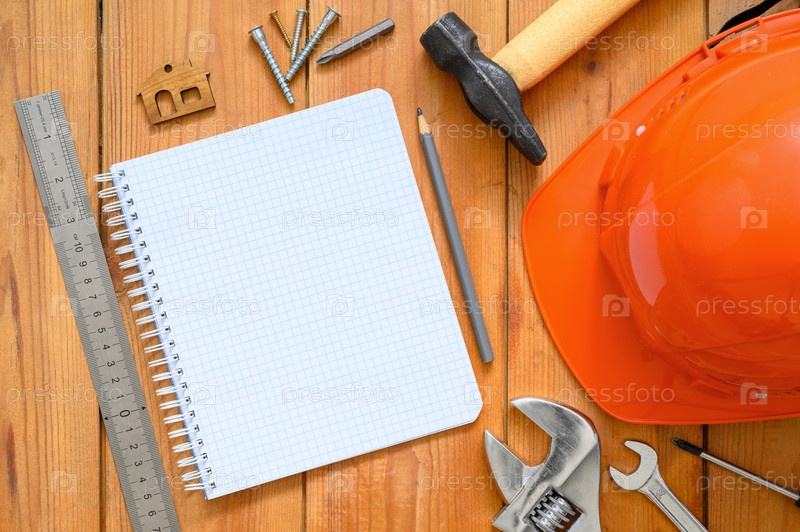 Блокнот рядом со строительными инструментами и строительным шлемом на деревянном верстаке. Блокнот с пустым свободным пространством. Плоская планировка, пространство для копирования