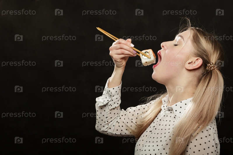 Женщина ест суши