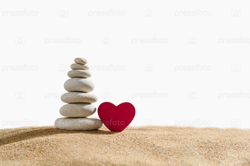 Башня из белой гальки с красным сердцем на песке на белом изолированном фоне