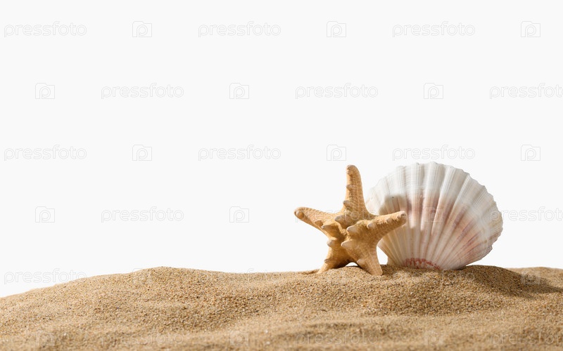 Большая белая ракушка и морская звезда на песке на белом фоне. Изолированный объект