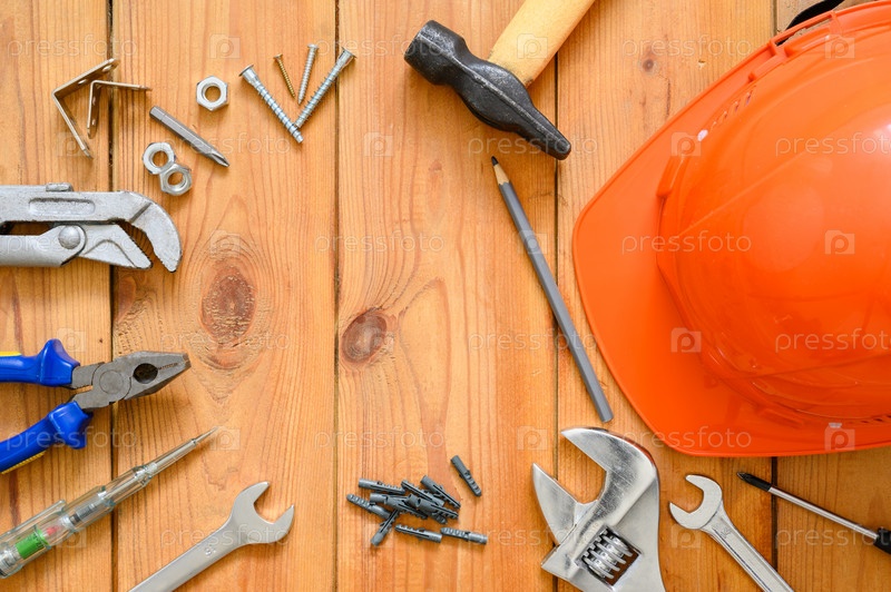 Строительные инструменты и оранжевая строительная каска на деревянном фоне. Пустое место в центре. Плоская планировка, пространство для копирования