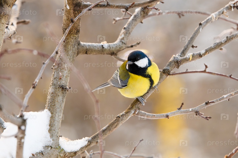 Зимняя желтая птица сидит на ветке. Маленькая синица на морозе