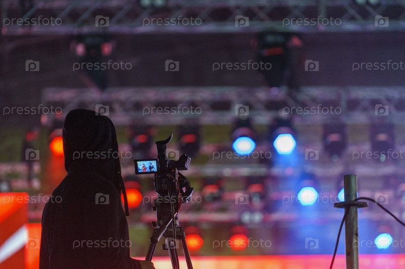 Видеооператор в черной одежде на фоне сцены с прожекторами