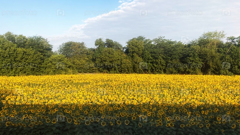Пейзаж с полем подсолнухов из окна поезда