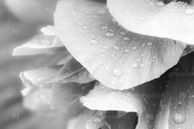 Блестящие капли дождя на лепестке пиона. Нежный воздушный художественный образ с мягким фокусом. Черно-белое изображение