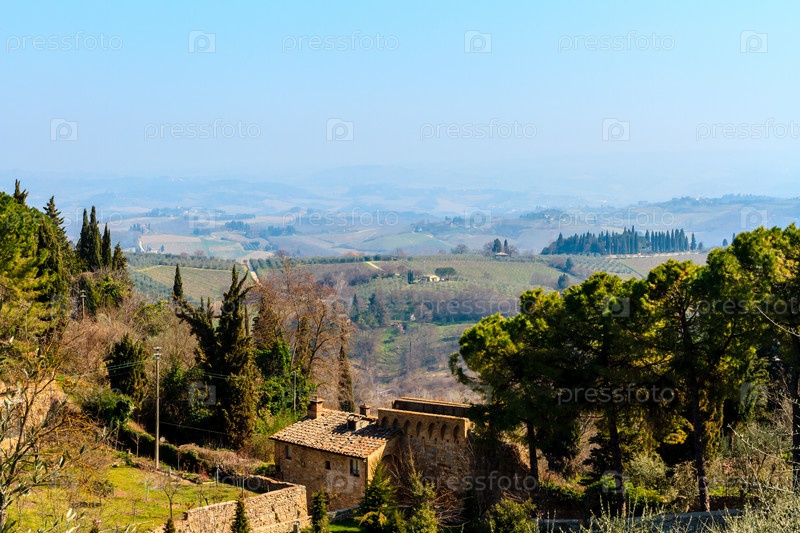 Раннее туманное утро. Красивый весенний пейзаж в Тоскане, Италии, Европе