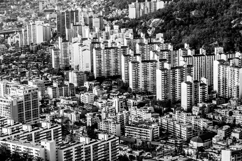 Типичные жилые районы Сеула, Южная Корея, черно-белое изображение