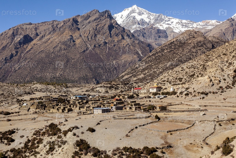 Азиатская горная деревня Верхний Писанг осенью, Непал, Гималаи, заповедник Аннапурна