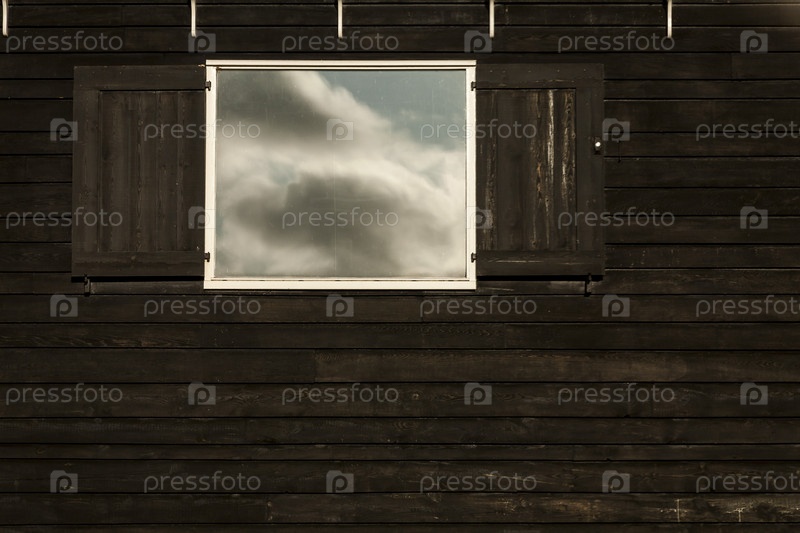 Облака, отражающиеся в открытом старомодном традиционном деревянном окне, Амстердам, Нидерланды