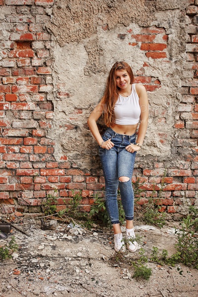 Красивая женщина в джинсах позирует на фоне кирпичной стены