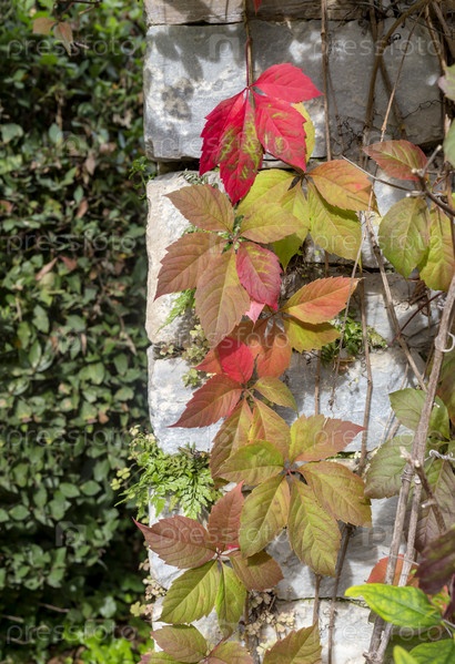 Растение (Parthenocissus quinquefolia) растет на стене в солнечный осенний день крупным планом