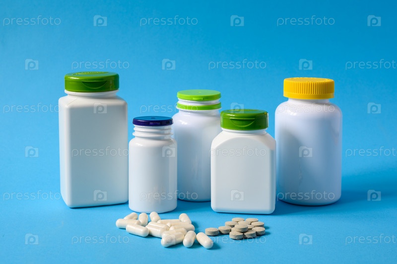 Лекарства на синем фоне. Белые банки для пилюль и таблеток