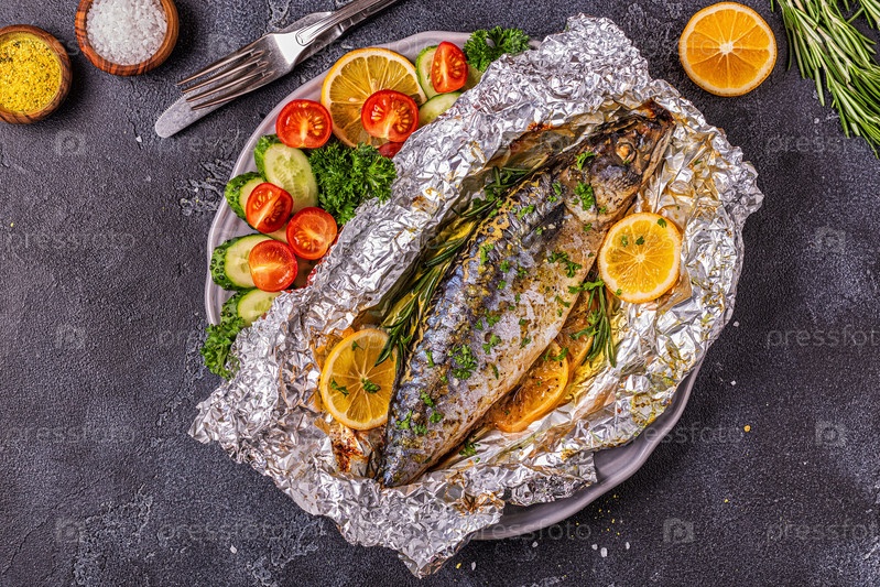 Скумбрия запеченная в фольге с овощами на блюде