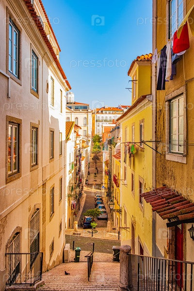 Узкая, аутентичная улица Лиссабона, Португалии