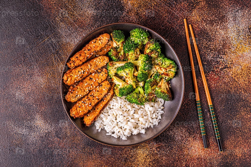 Жареный темпе с рисом и брокколи