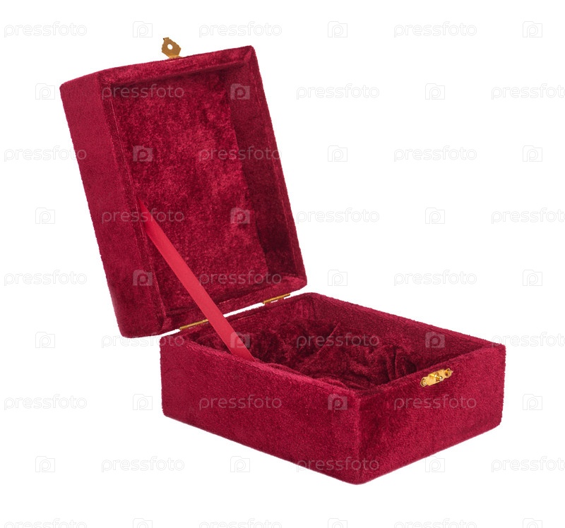Большая открытая пустая красная бархатная подарочная коробка крупным планом, изолированная на белом фоне, малая глубина резкости
