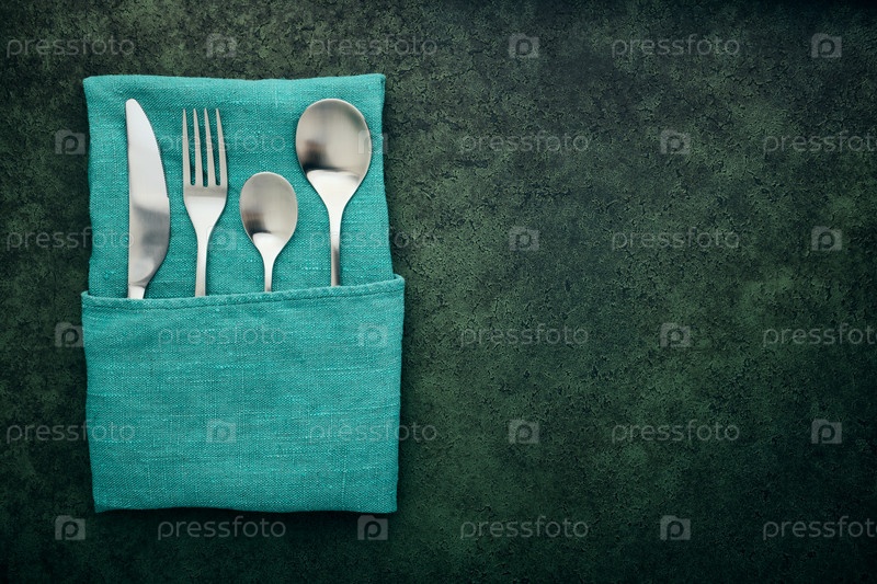 Льняной карман для салфеток со стальными столовыми приборами на темно-зеленом фоне с копией пространства