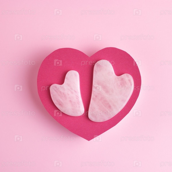 Квадратная плоская планировка с камнями для массажа лица из розового кварца на декоративном сердце на розовом фоне