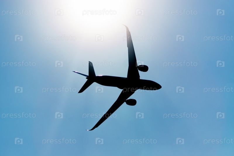 Силуэт самолета, летящего в небе под солнцем