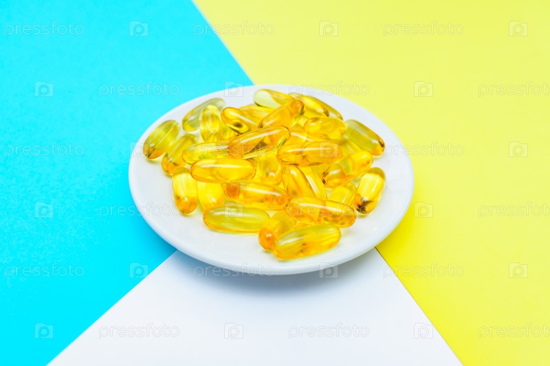 Капсулы с омега-3 рыбьим жиром на белой тарелке на белом, синем и желтом фоне. Креативная концепция здравоохранения