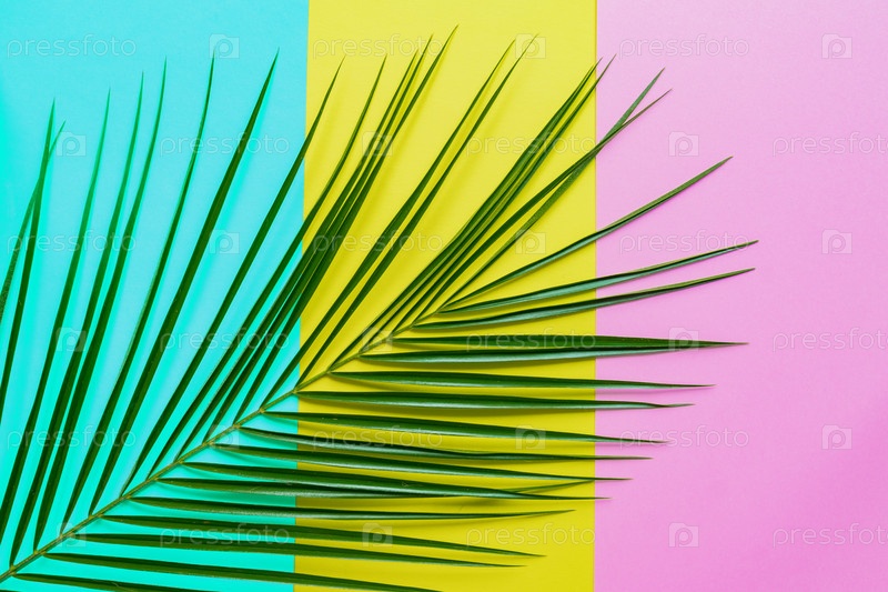 Тропический пальмовый лист с тенями на синем, розовом и желтом фоне. Летняя концепция