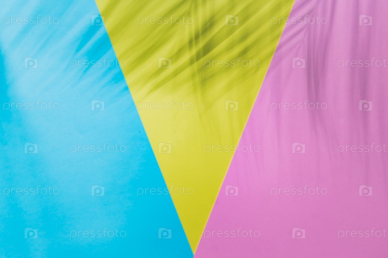 Тени пальмового листа на ярко-розовом, желтом, синем фоне. Место для текста