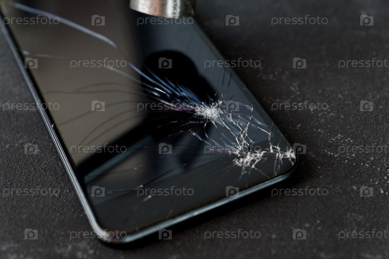 Смартфон с разбитым стеклянным экраном и молотком на темном фоне