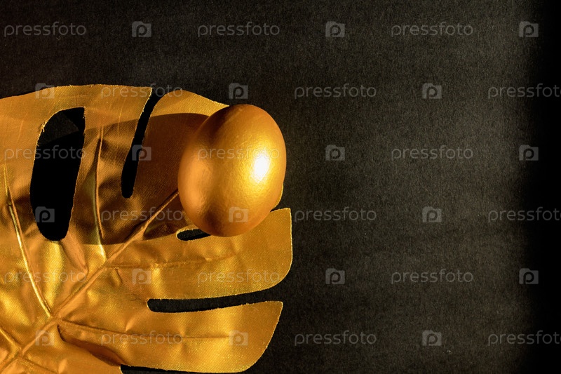 Стильная рамка с золотым пасхальным яйцом и листом монстера на черном фоне. Копировать пространство