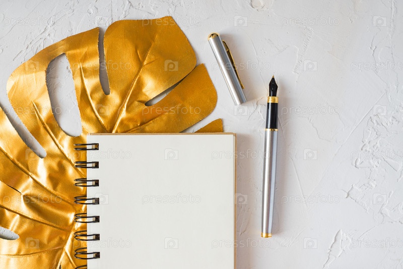 Стильный домашний офисный стол с бумажным блокнотом, золотой ручкой и тропическим листом монстера. Плоская планировка, вид сверху, пространство для копирования. Концепция женского рабочего пространства