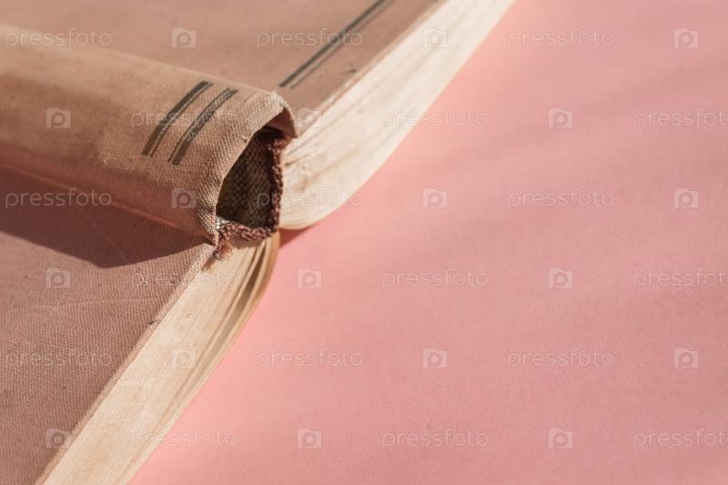 Откройте старую книгу в твердом переплете на розовом фоне с копией пространства. Образовательная концепция