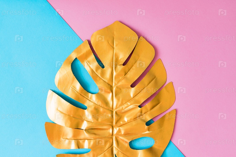 Стильный фон с золотым листом монстеры розового и синего цвета