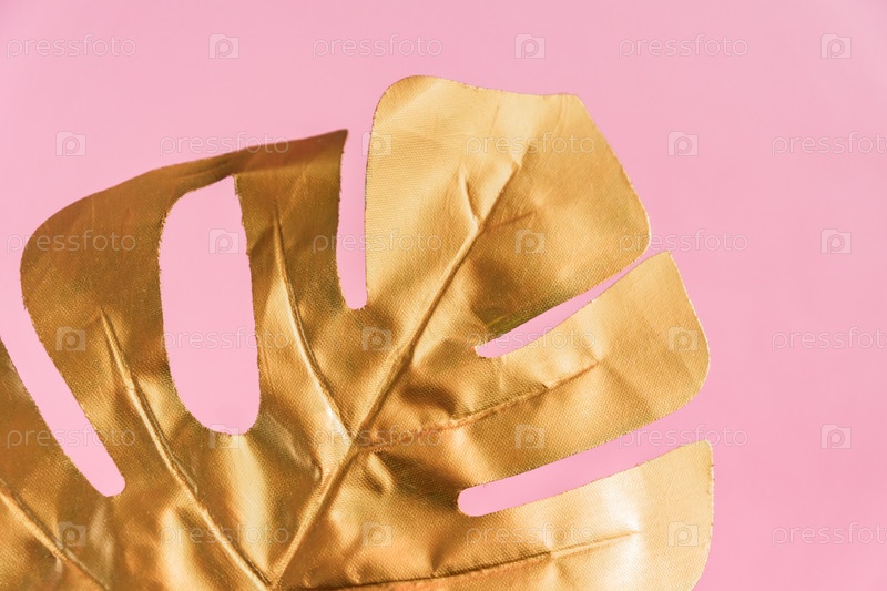 Стильный фон с золотым листом монстеры розового цвета