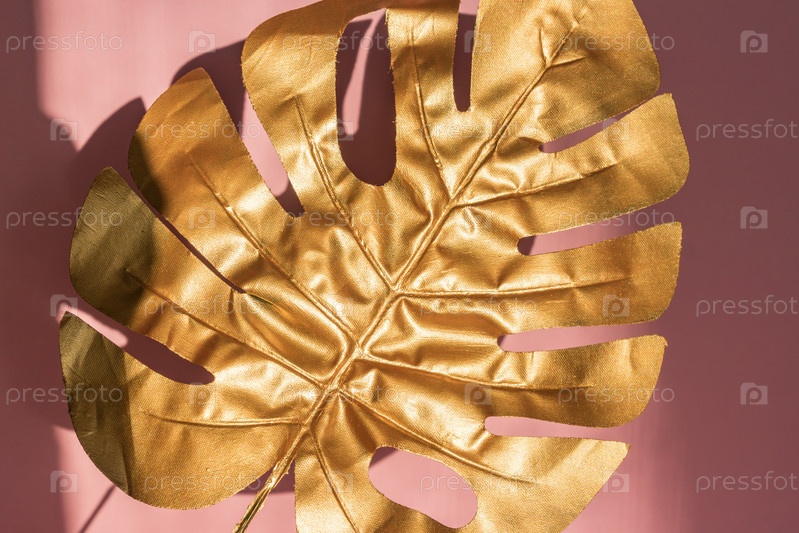 Стильный фон с золотым листом монстеры розового цвета с огнями и тенями