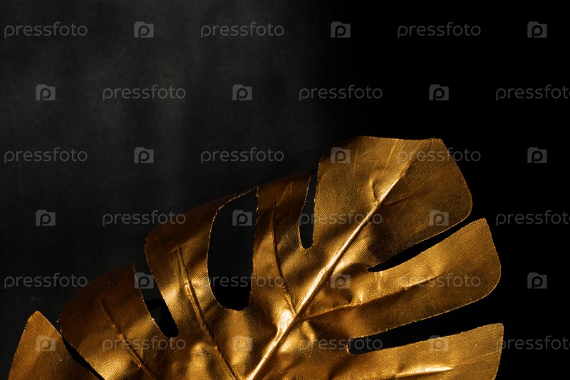 Модный роскошный черный фон с золотым листом монстера. Скопируйте место для текста