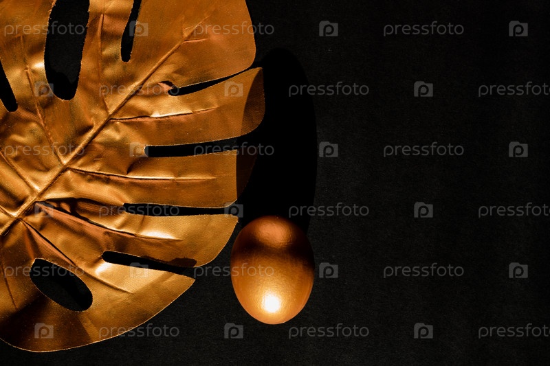 Стильная рамка с золотым пасхальным яйцом и листом монстера на черном фоне. Копировать пространство